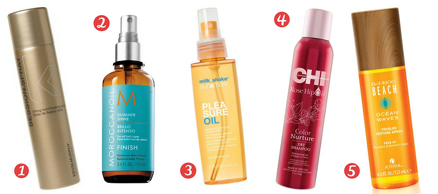 Glamot tip: 1) Kevin Murphy Session Spray with UV shield for colour protection; 2) Moroccanoil Glimmer Shine Spray Infused with Argan oil and UV filters; 3) Milk Shake Sun & More Pleasure Oil moisturizing oil for hair & body; 4) CHI Rose Hip Oil Dry Shampoo for color protection with vitamins; 5) Bamboo Beach Ocean Waves Tousled Texture Spray creates beach waves with UVA/UVB protection.