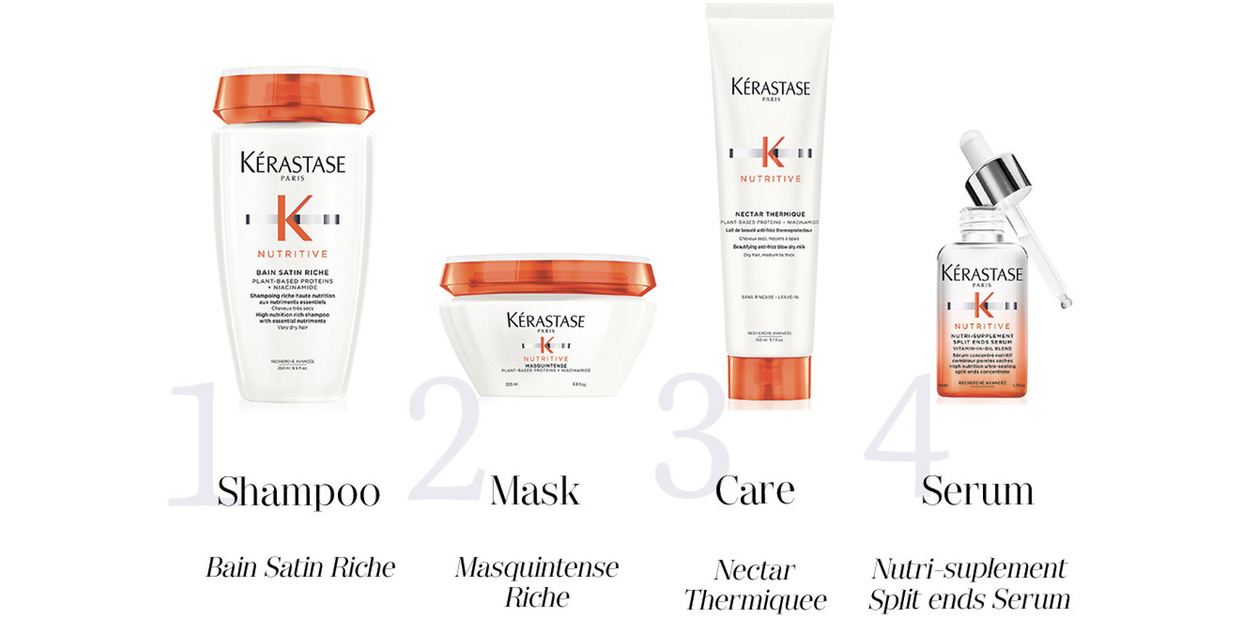 - Solution: Kérastase Nutritive Bain Satin Riche + Kérastase Nutritive Masquintense Riche + Kérastase Nutritive Nectar Thermique + Kérastase Nutritive Nutri-Supplement Split End Serum