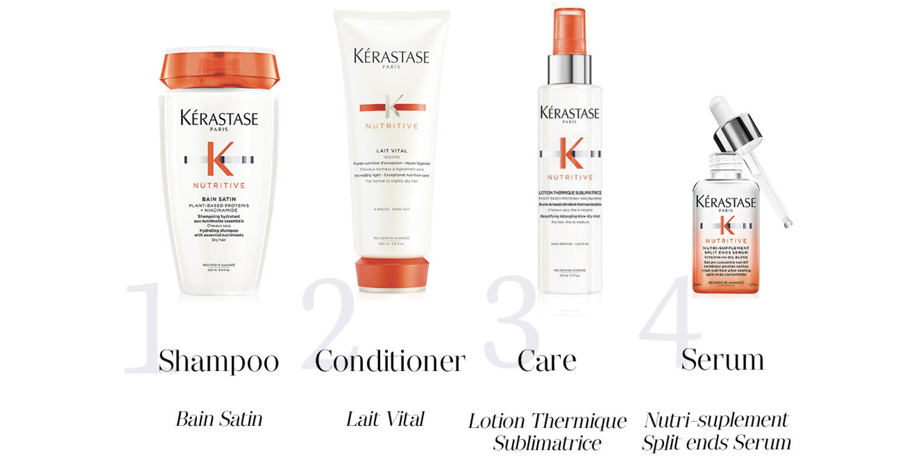 - Solution: Kérastase Nutritive Bain Satin + Kérastase Nutritive Lait Vital + Kérastase Nutritive Lotion Thermique Sublimatrice + Kérastase Nutritive Nutri-Supplement Split End Serum