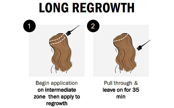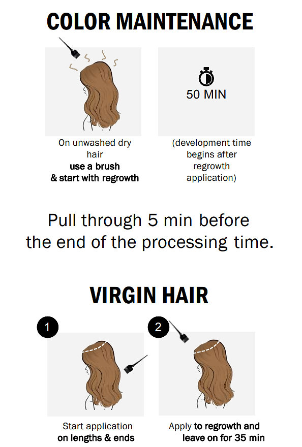 Mix color with developer at the recommended ratio. Apply to dry hair. Leave for 50 minutes. When development time is complete, add a little warm water to the hair and gently emulsify. Thoroughly rinse color from the hair and shampoo.