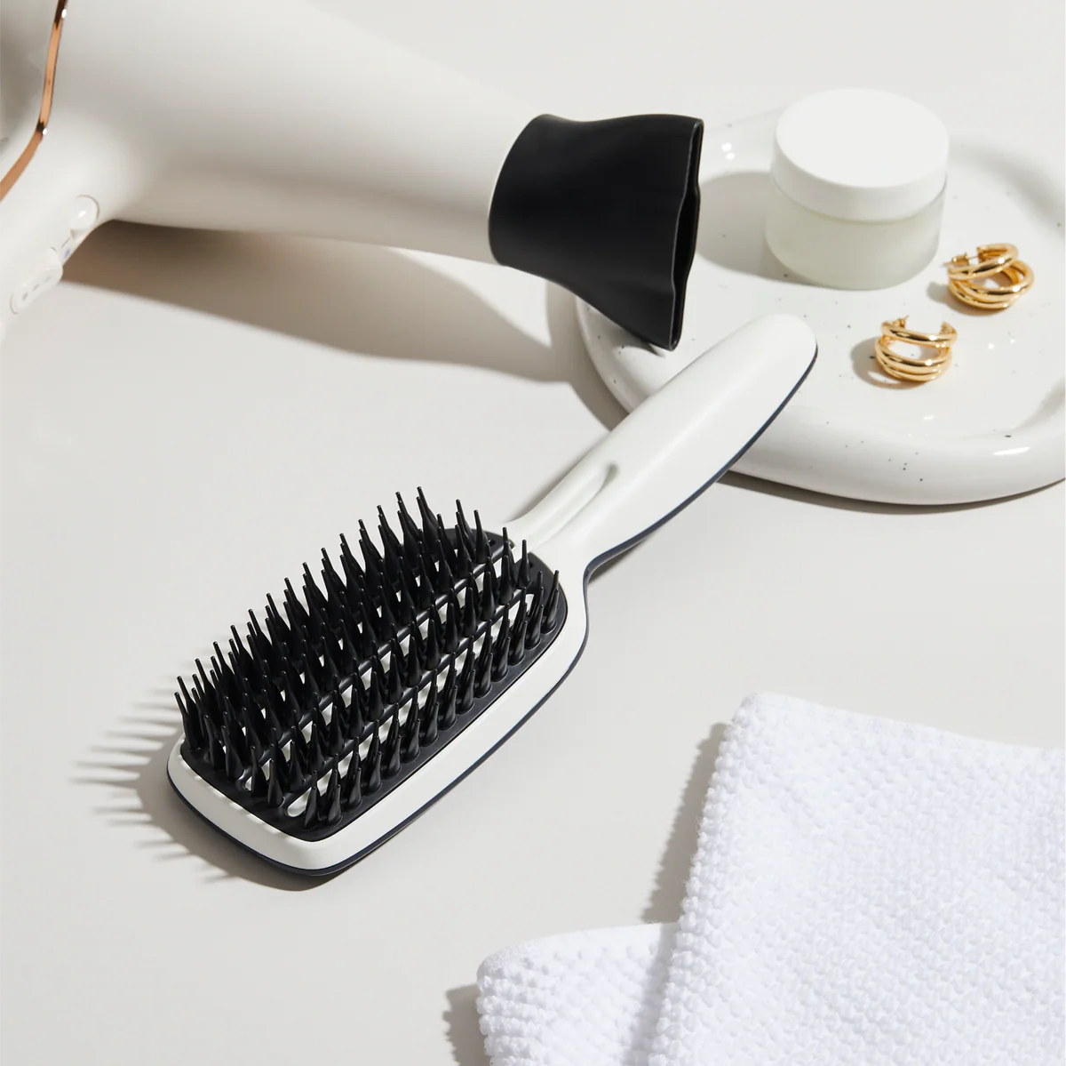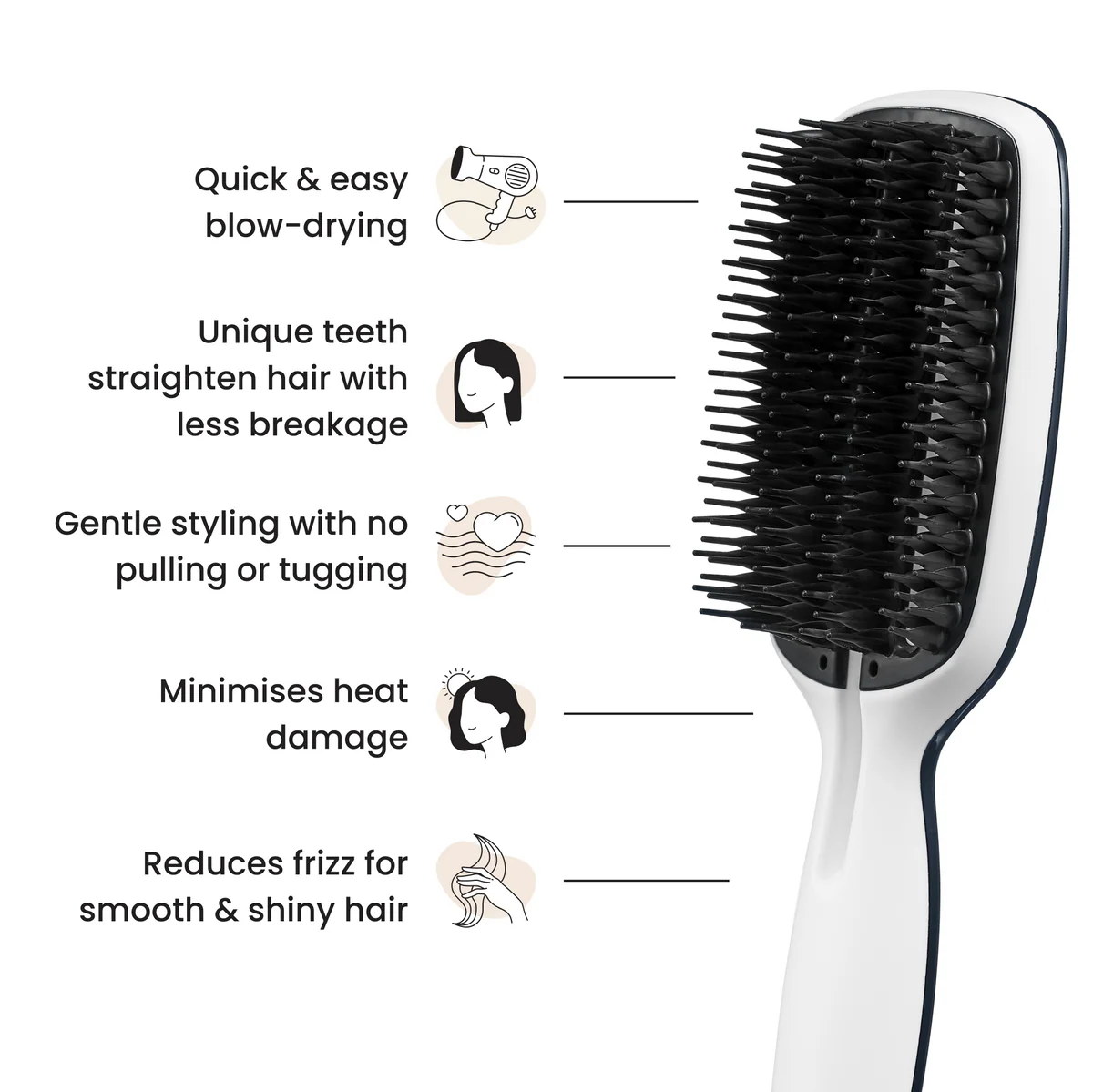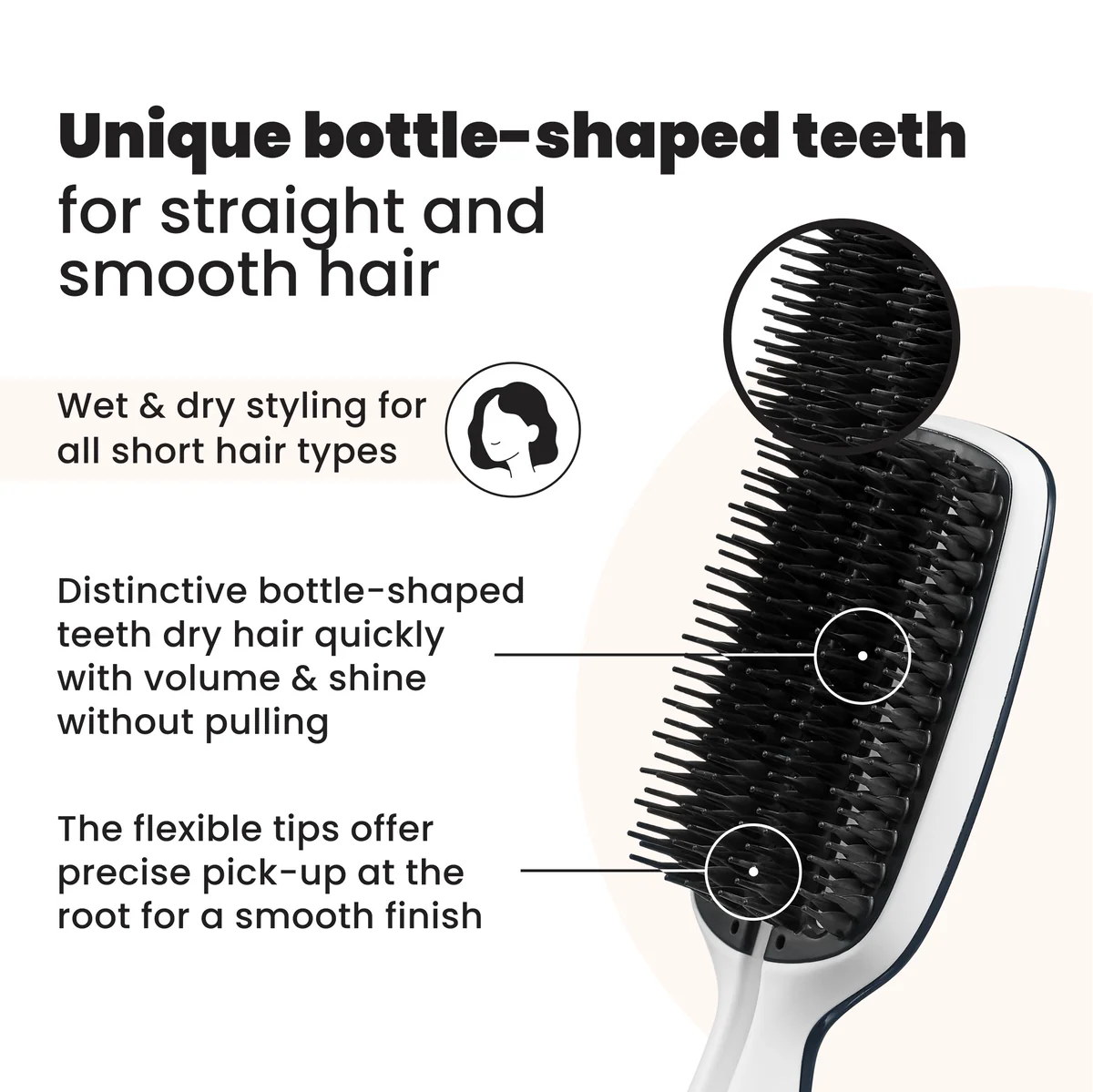 With ground-breaking teeth technology, the Blow-Styling Smoothing Tool has fixed base teeth with built in tension and slight flexibility at the tips. Delivering flow tension, the teeth allows the hair to snake through for a quick, smooth and gentle blow-dry without pulling or stretch-drying.
