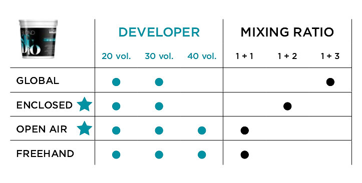 Multi-techniques lightening powder, up to 8 levels. Suitable for natural or coloured hair.