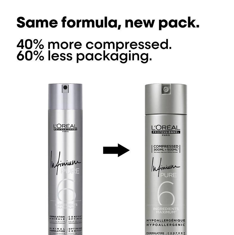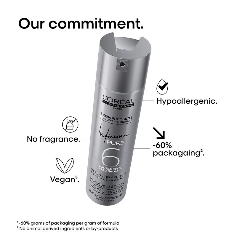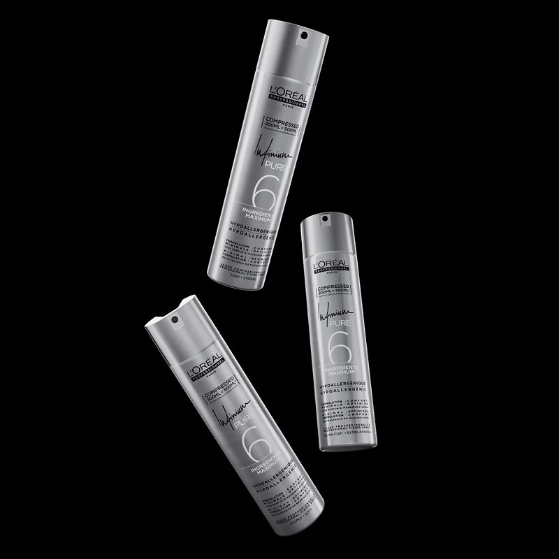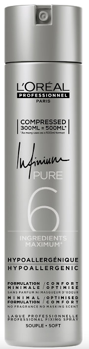 Hypoallergenic fragrance-free hairspray allies comfort of use and performance. It has been created with heavy professional use in mind: its minimal formulation provides unrivalled comfort and minimizes the risk of allergic reactions. This ultra-fine and extra dry hairspray provides high fixation without stiffness for any hair look. Leaves no odor in salon or on hair.