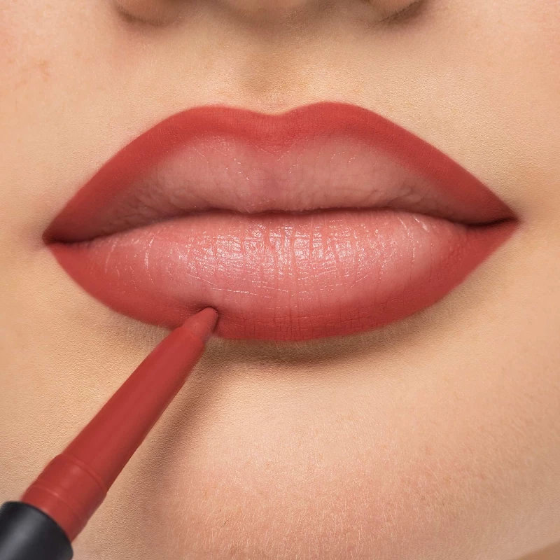 Outline your lip with a color matching your lip color; for a more dimensional effect, blend towards the centre of the lip.
