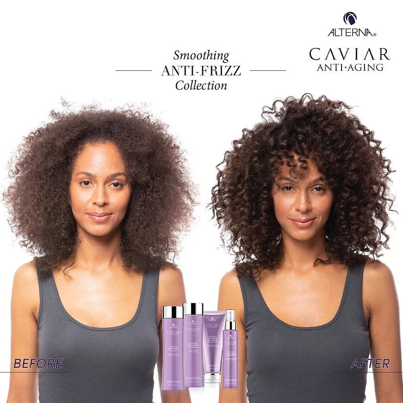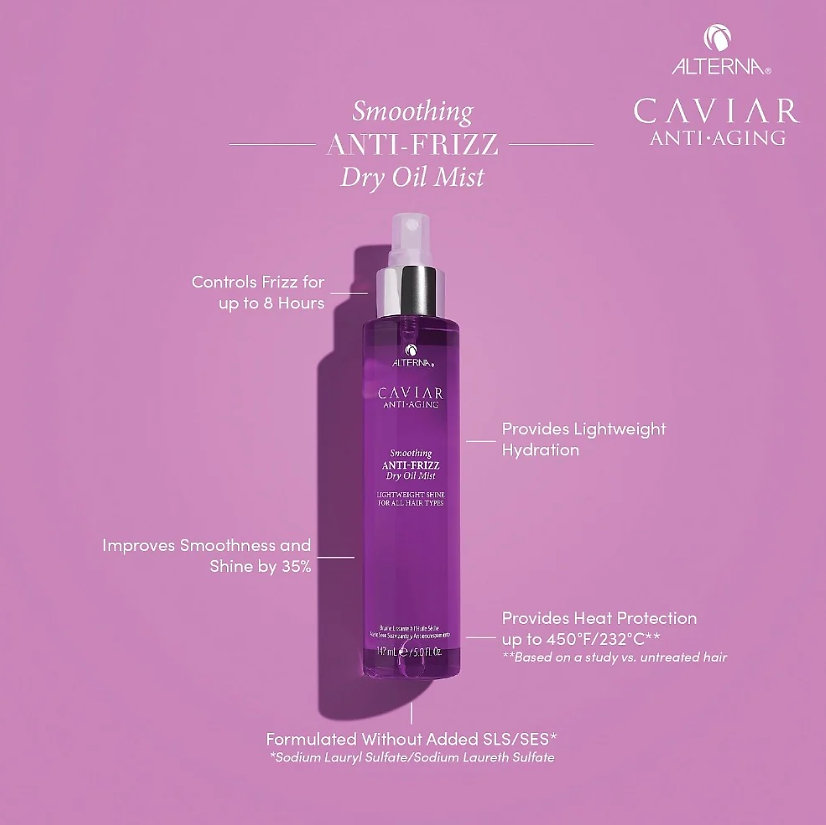 Indulge in luxurious care with the Alterna Caviar Smoothing Anti-Frizz Dry Oil Mist, a lightweight oil mist that instantly tames frizz, smooths unruly strands, and imparts radiant shine. Powered by the exclusive Climate Shield Complex, it protects hair from humidity for up to 8 hours, while caviar extract nourishes and restores vitality. Leaves hair silky soft, lightweight, and full of life, with no greasy residue.