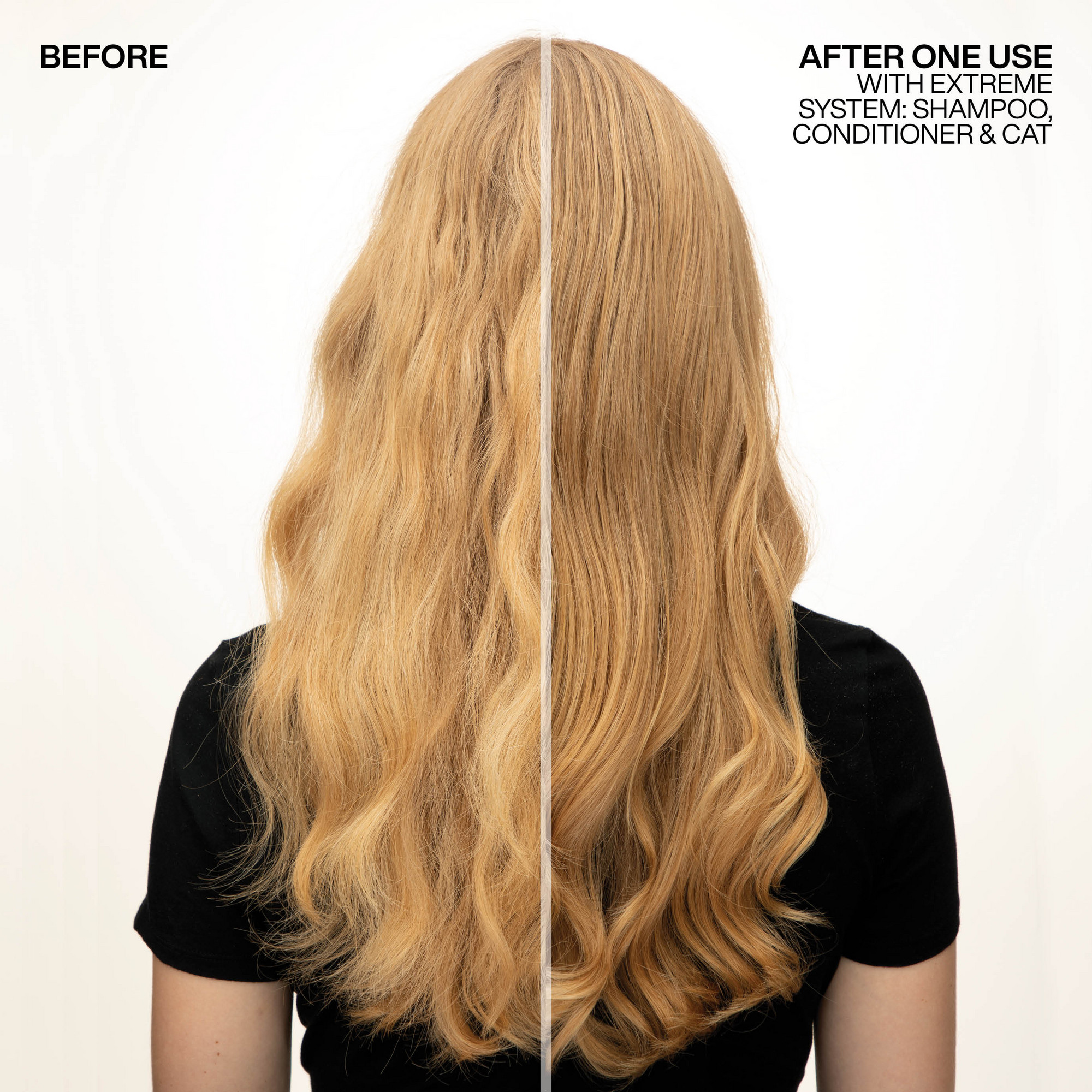 After shampooing with Redken Extreme Shampoo and towel-drying, spray onto hair and scalp, focusing on the most damaged areas of the hair. Leave on for 3-5 minutes, thoroughly rinse, and then follow with Redken Extreme Conditioner. Extreme CAT is recommended for use 1-3 times a week as a supplement to regular hair care. In case of contact with eyes, immediately rinse with an ample amount of clean water.