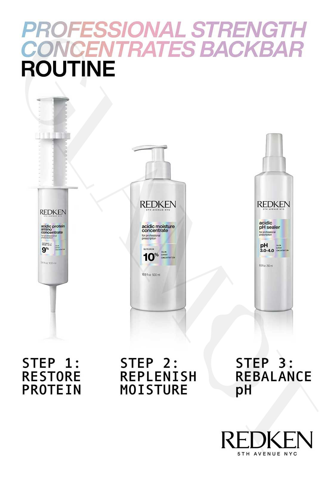 It is part of the powerful acidic backbar system offering professional, customized haircare services to supports healthy hair in 3 key areas: protein, moisture, & pH.