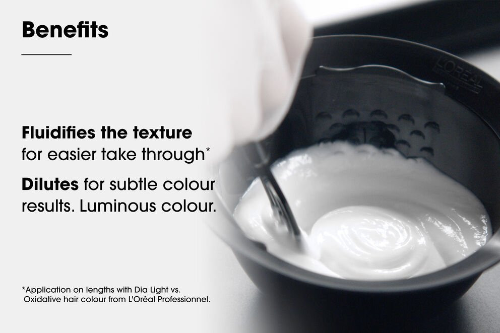 Mix with a ratio of 1 +1.5 with a Dia Light shade and Diactivateur for a Gloss service on previously coloured hair .