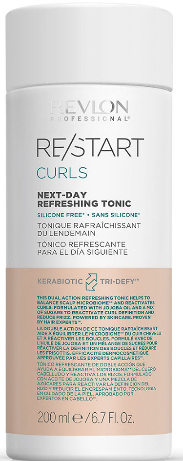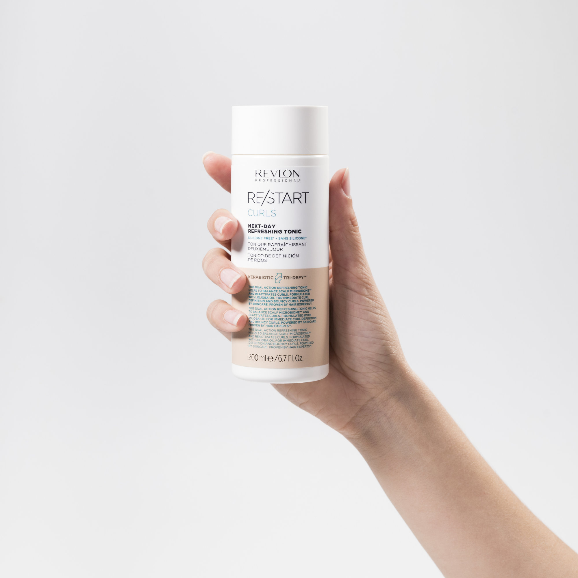 Use day 2 tonic to reactivate curls. Apply first from the centers to the ends and spread evenly, then squeeze the hair to reactivate and define the curls.