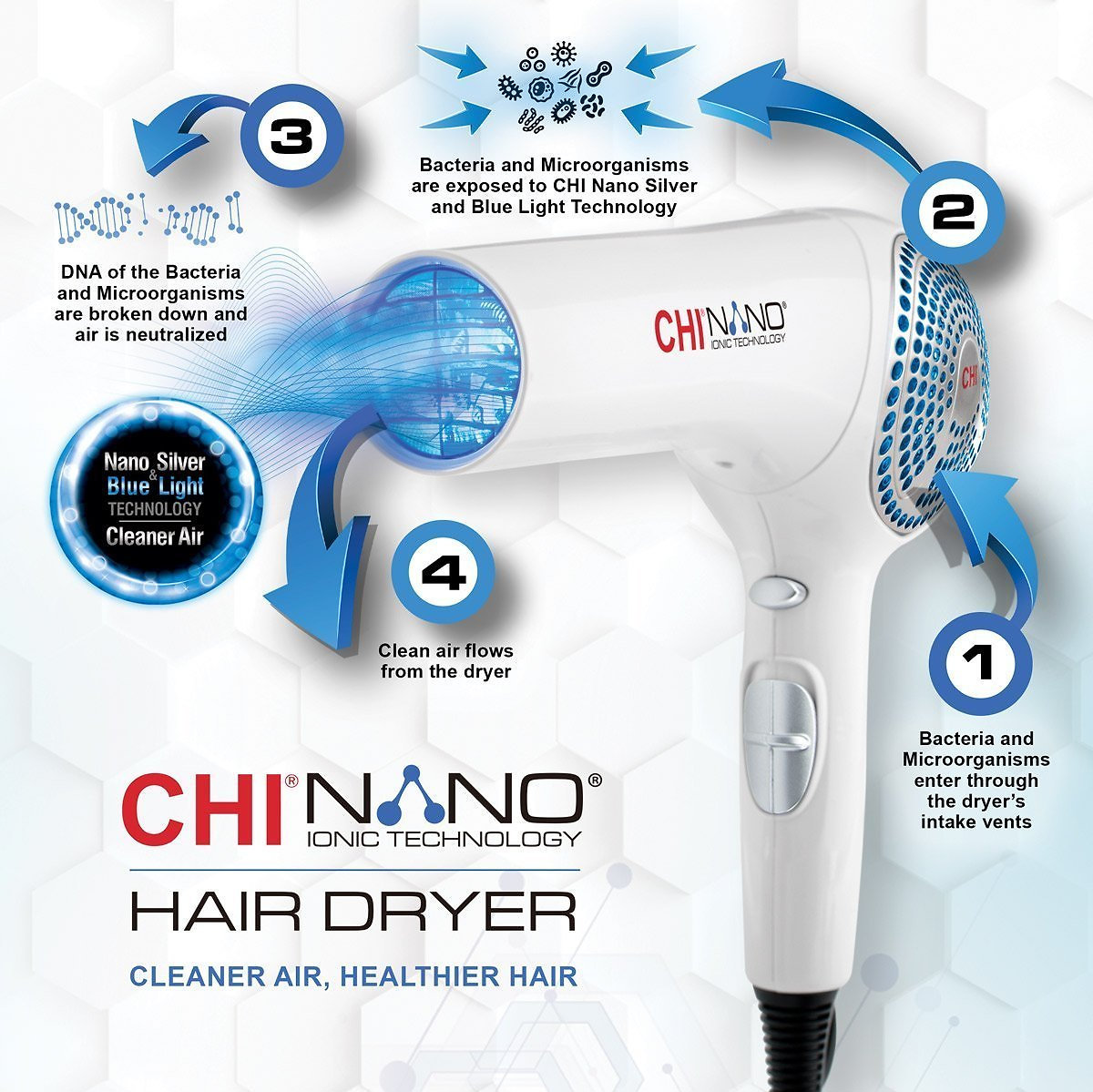 CHI Nano Silver & Blue Light Technology - this technology uses nano silver and blue LED lights that emit wavelengths capable of killing bacteria and microorganisms in the air. It's similar to technology used in hospitals and medical facilities to sterilize airborne pathogens and surfaces. This way, it not only neutralizes the surrounding air but also keeps the inside of the dryer free from bacterial buildup, germs, dandruff, and dust mites, ensuring a healthier blow-drying experience.
