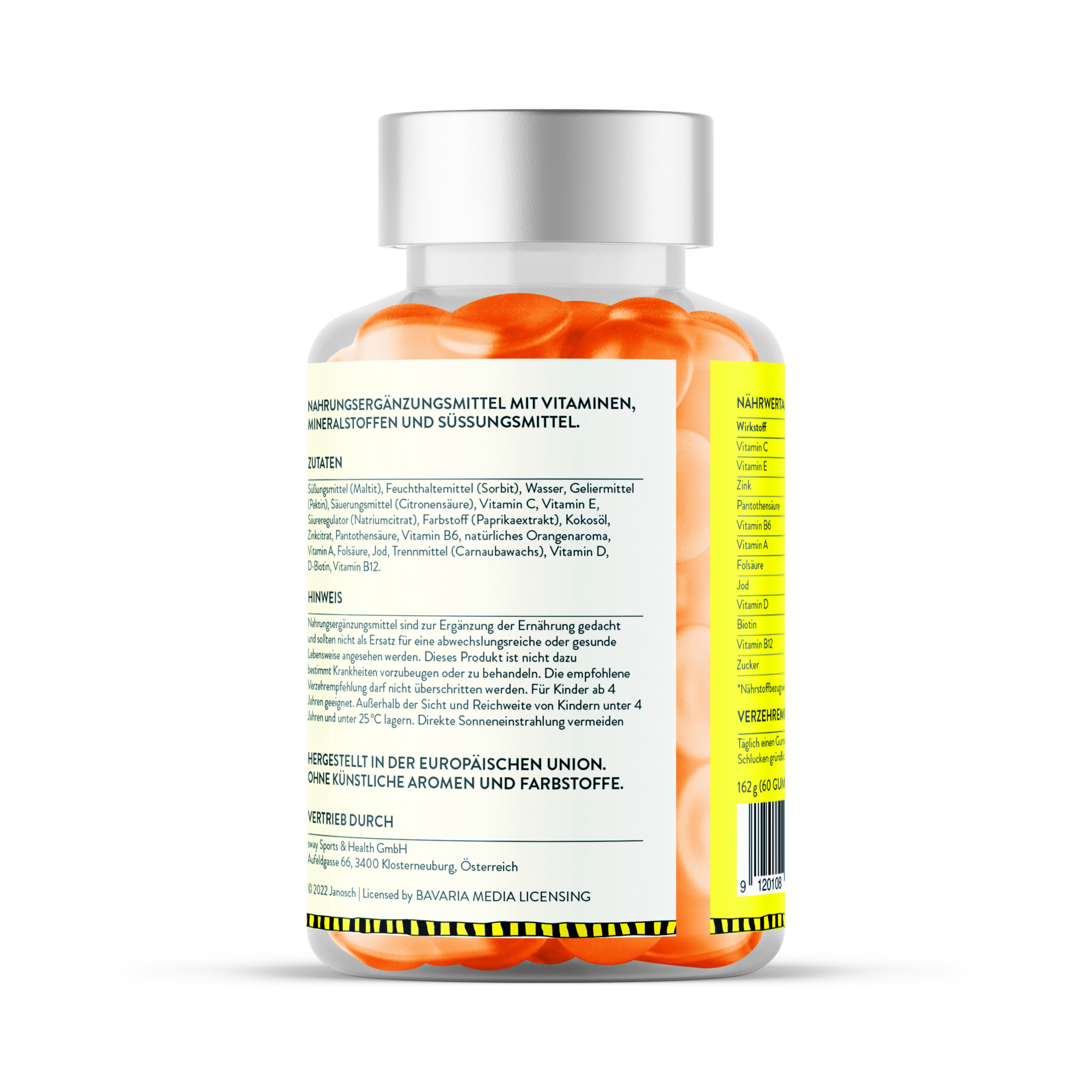 Sweetener (maltitol) • humectant (sorbitol) • water • gelling agent (pectin) • acidulant (citric acid) • vitamin C • vitamin E • acidity regulator (sodium citrate) • colourant (paprika extract) • coconut oil • zinc citrate • pantothenic acid • vitamin B6 • natural orange aroma • vitamin A • folic acid • iodine • anti-caking agent (carnauba wax) • vitamin D • D-biotin • vitamin B12