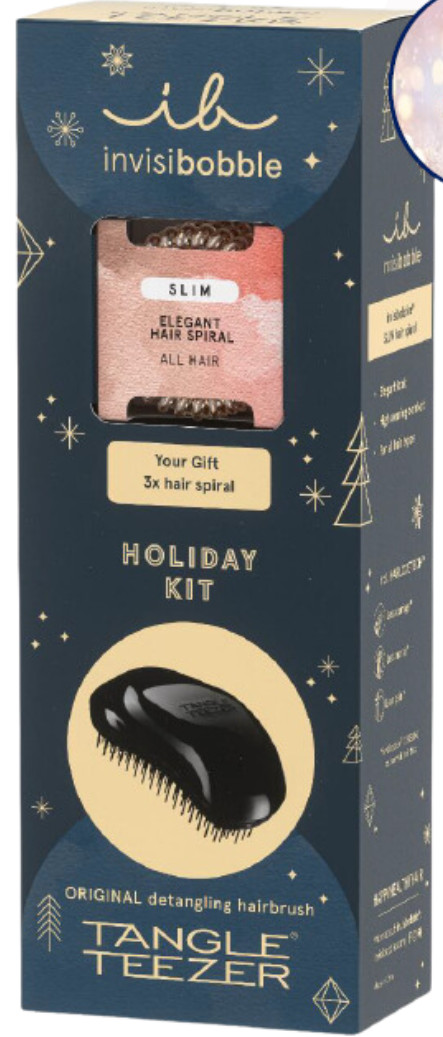 This beautiful gift set from the Tangle Teezer brand is a wonderful gift for every woman who cares about her hair. It includes a black Original hairbrush and 3 metallic gold Invisibobble Slim hair ties, which are not only practical but also stylish.
