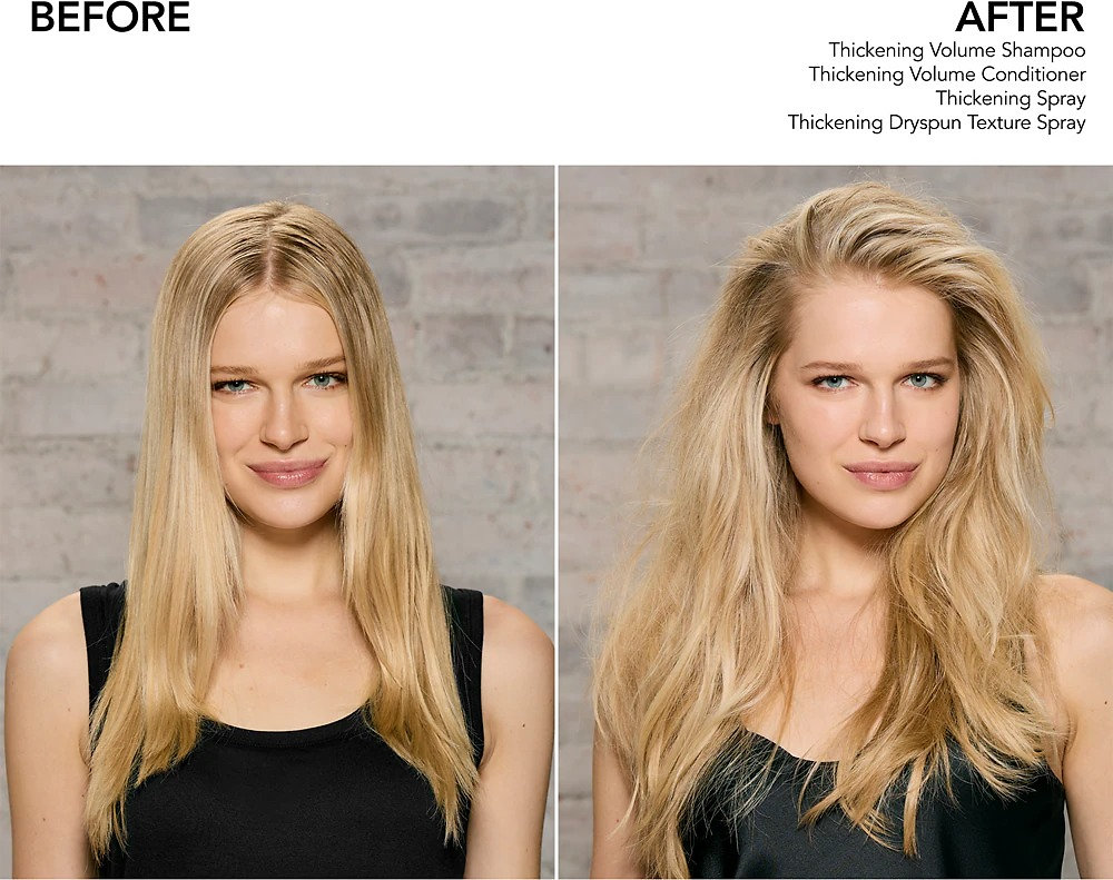 Work a dab of Thickening Volume Shampoo into wet hair, lather, and rinse. Follow with Thickening Volume Conditioner.
