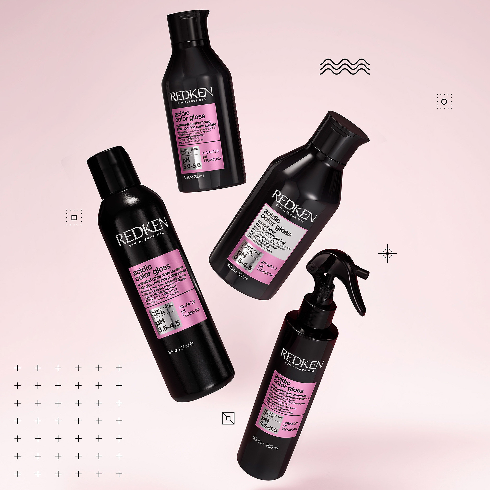 - Acidic pH - maintains balanced pH in hair and seals the hair cuticle, maintaining long-lasting shine.