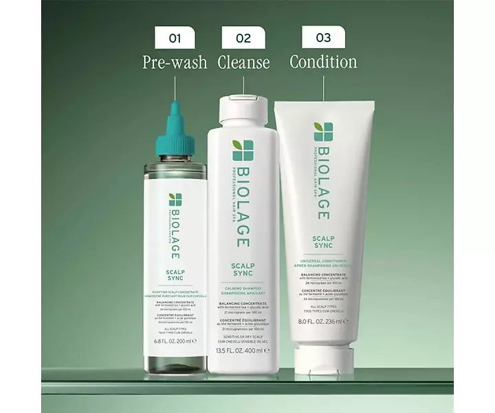 Apply shampoo evenly to wet hair and gently massage into the scalp and hair. Rinse thoroughly. Repeat if necessary. For best results, follow with Biolage ScalpSync Universal Conditioner.
