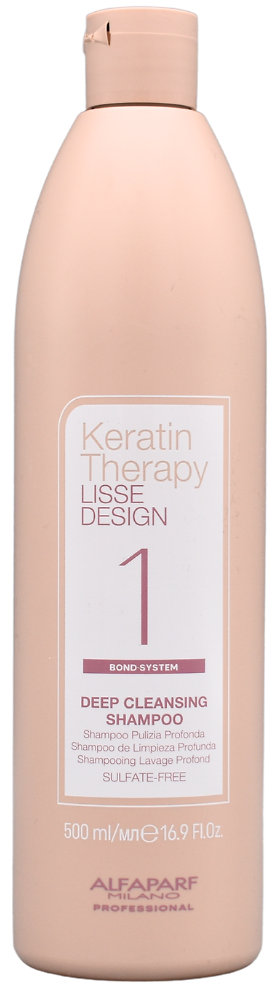 Alfaparf Milano Keratin Therapy Lisse Design Deep Cleansing Shampoo is specially designed to thoroughly cleanse hair before keratin treatment. This shampoo deeply purifies hair fibers and scalp, removing residue from styling products, impurities, and excess oil. It prepares the hair for keratin treatment application, ensuring maximum effectiveness of the treatment and a long-lasting smooth appearance.