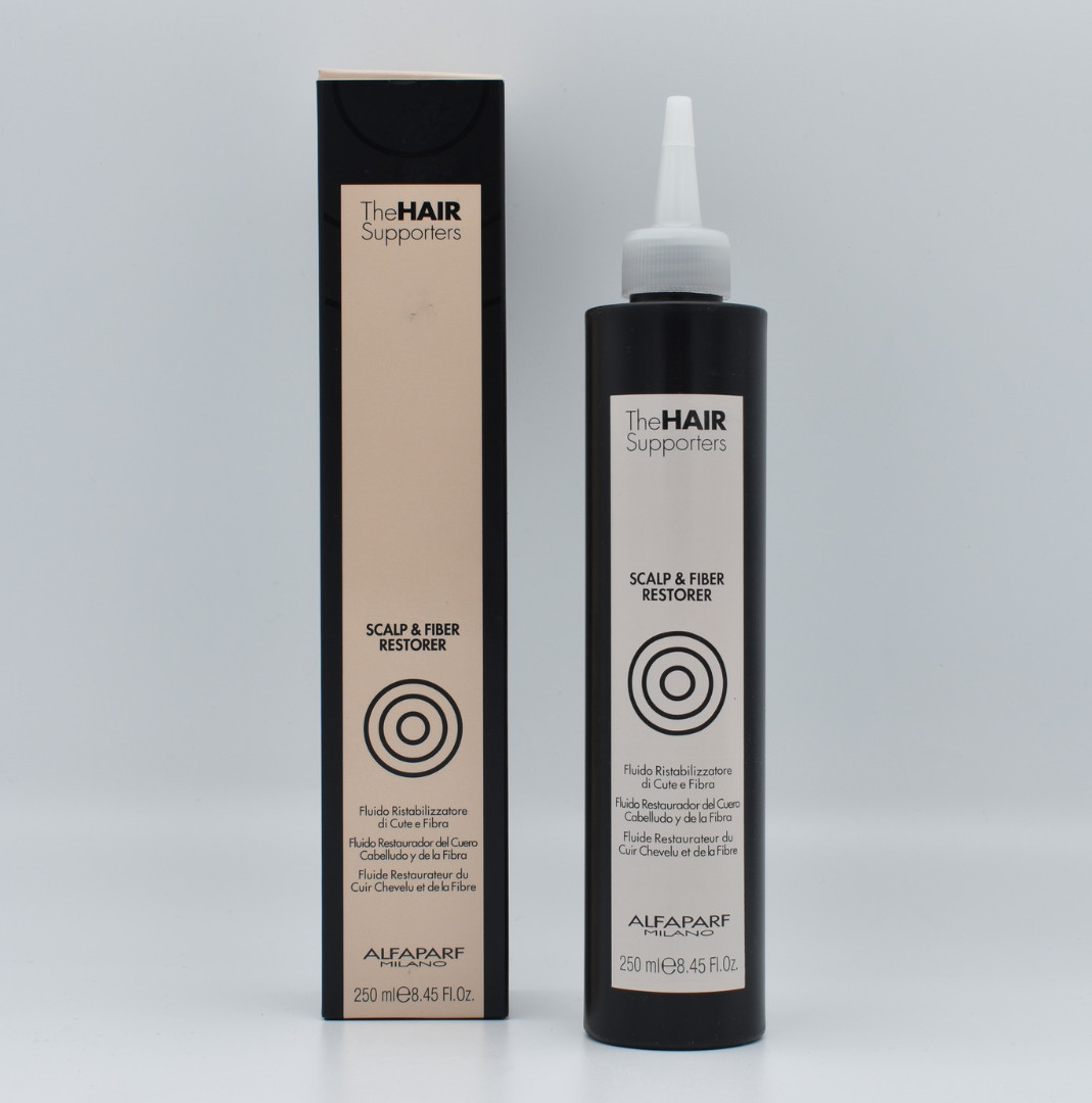 Alfaparf Milano The Hair Supporters Scalp & Fiber Restorer is a restorative fluid designed to rebalance the scalp's pH and improve hair health after chemical treatments such as coloring, bleaching, or perming. Its unique formula provides comprehensive care for both hair and scalp.