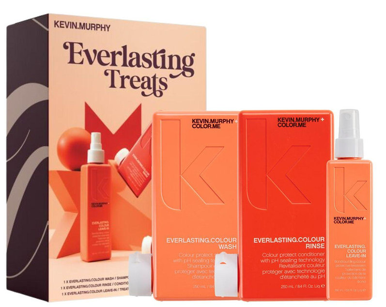Want your colored hair to stay vibrant and full of life for as long as possible? With Kevin Murphy Everlasting Colour Everlasting Treats, it's no problem! This set is specially designed to protect color and care for color-treated hair. It contains EVERLASTING.COLOUR WASH shampoo, EVERLASTING.COLOUR RINSE conditioner and EVERLASTING.COLOUR LEAVE-IN leave-in conditioner, which together protect the color from fading, strengthen the hair and give it a dazzling shine.