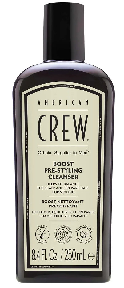 Its lightweight vegan formula, free from silicones and parabens, won’t weigh hair down. It supports natural shine and helps balance the scalp microbiome for healthier hair growth. The perfect foundation for styling products such as American Crew Boost Powder.