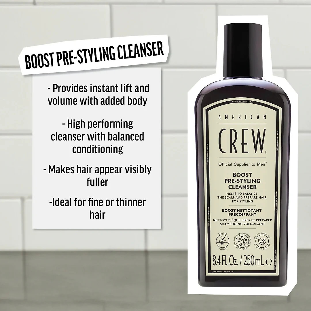 Give fine and flat hair an instant boost of volume and strength – right from the wash. American Crew Boost Shampoo is specially developed for men with fine or thinning hair. It works as the first step of styling – gently cleansing, hydrating, and preparing the hair for further styling so your look gains fullness, texture, and easy manageability.
