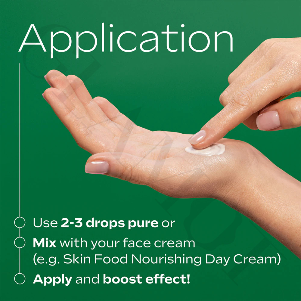 Apply 2–3 drops directly to clean skin or mix with your favorite face cream, such as Skin Food Day Cream. Gently massage into the face, neck, and décolleté. For a luminous finish, add a drop to your makeup.