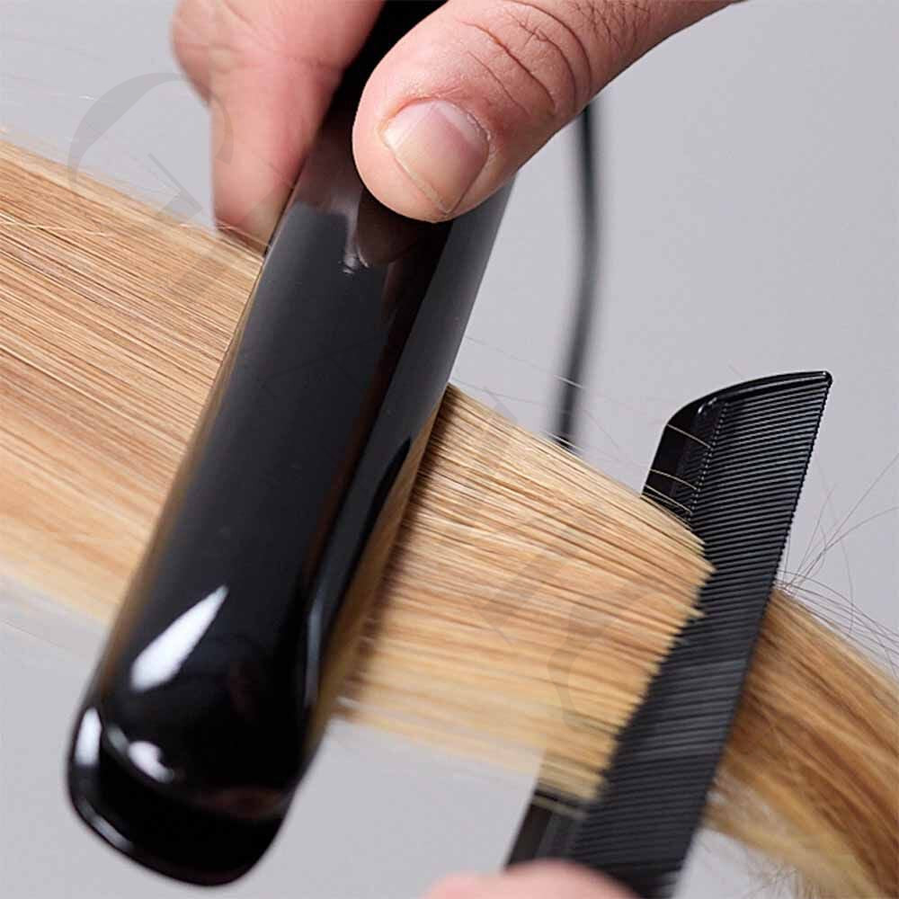 Straighten the hair section by section with a flat iron, about 6–10 passes per strand.