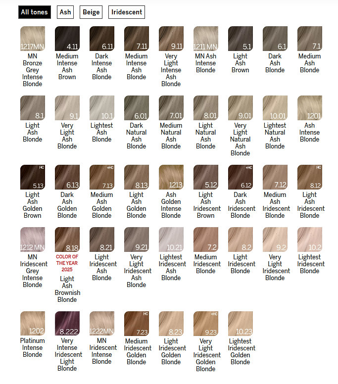 8.222 Very Intense Iridescent Light BlondeA professional permanent hair color focused on pure cool shades. It helps neutralize unwanted warm undertones and creates elegant ashy, pearly, or iridescent tones with long-lasting results. Thanks to its caring formula, it works gently and leaves hair soft, shiny, and visibly healthier — even after a chemical service.
