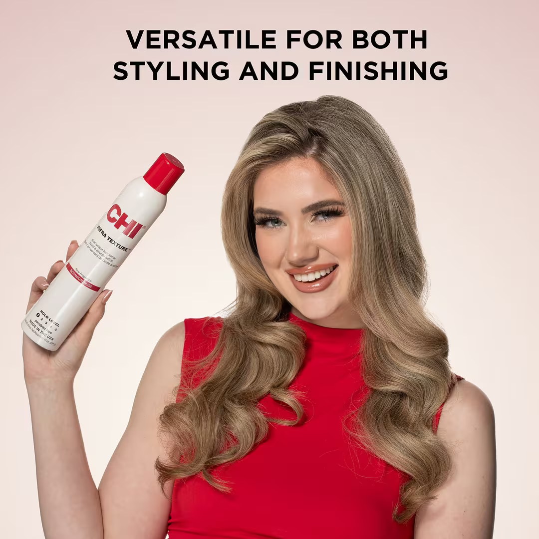 CHI Infra Texture Dual Action Hair Spray is a quick-drying hairspray designed for styling and final hold. It helps create volume, texture, and natural movement while adding shine and light control. Thanks to its versatile formula, it is suitable for various types of styling and can be used both during styling and as a final hold step.