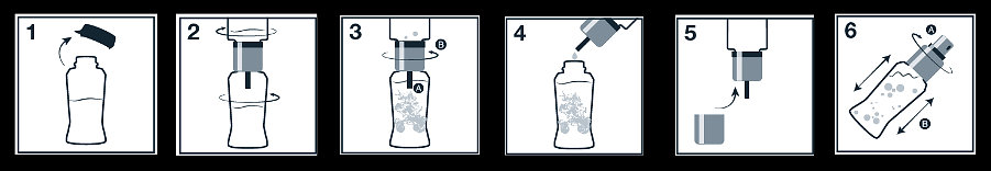 - The dispenser automatically delivers one dose of 6 ml. Wait until the entire dose is released into the Concentré ampoule (A). Unscrew the booster (B).
